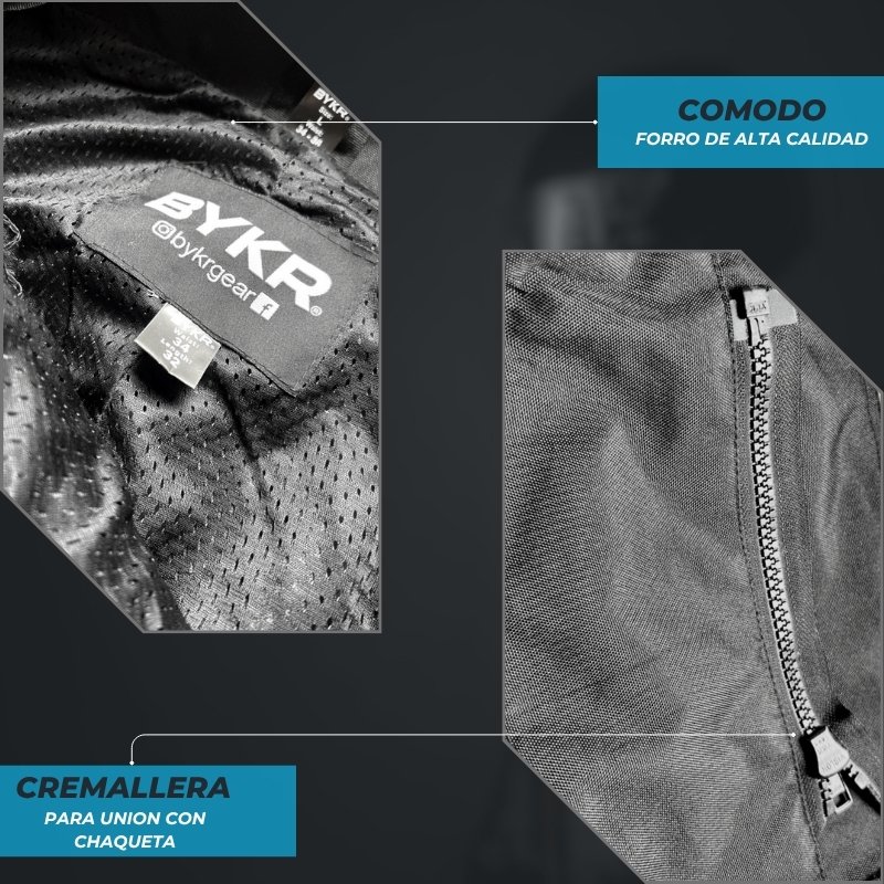 • Construcción duradera y rendimiento para todo tipo de clima, perfecto para todos los deportes de motor. Meticulosamente elaborados con telas de cordura y reissa resistentes al agua, los pantalones BYKR te mantienen seco durante los paseos lluviosos. Experimenta un rendimiento impermeable extremo y mantente enfocado en el camino por delante.